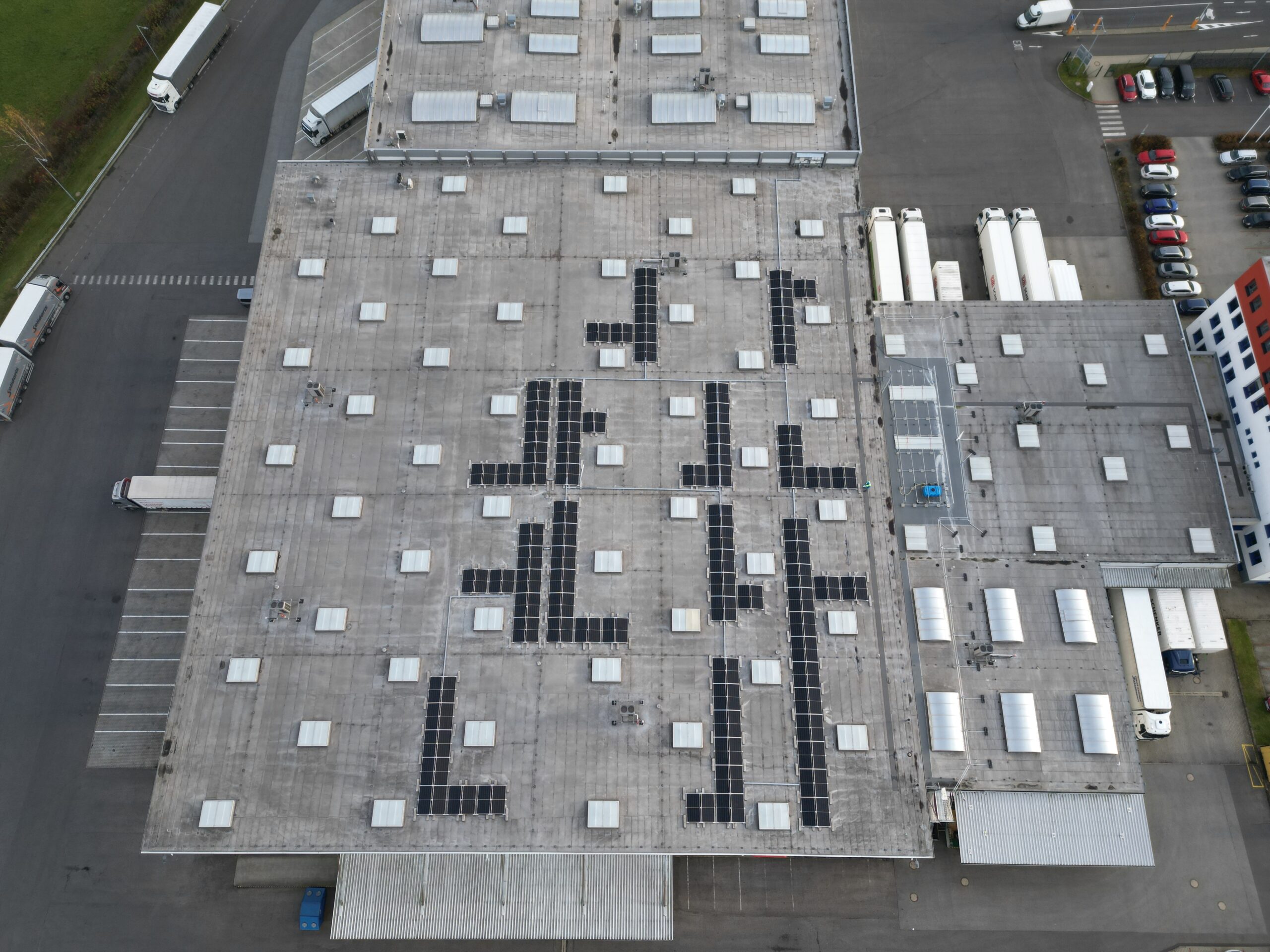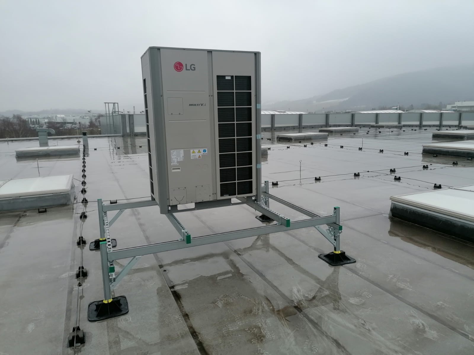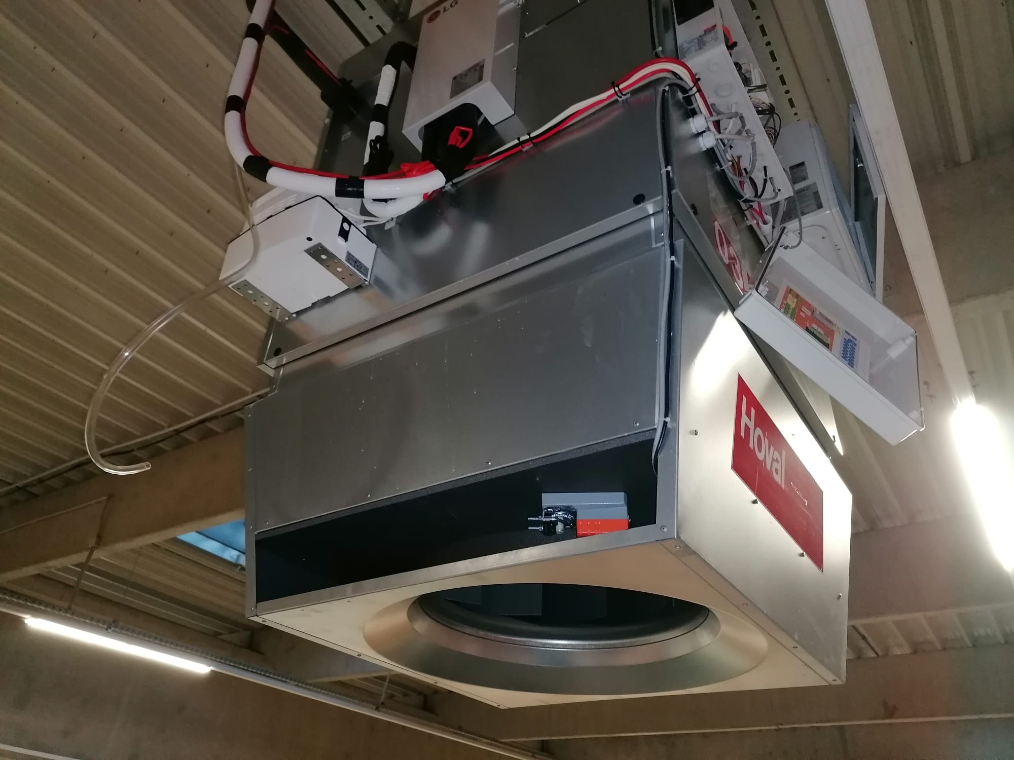 Instalace 9 ks vzduchotechnických jednotek Hoval Topvent v halách s propojením na tepelná čerpadla LG o jmenovitém výkonu 40 kW. Celkový instalovaný výkon v halách je 360 kW.